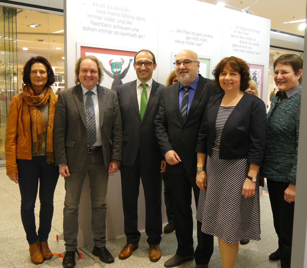 „Mama ist irgendwie ganz komisch. Sie hat Angst und sagt, keiner soll rausgehen.“ So beschreibt Alexander seinen Alltag. Dazu hat der Junge eine kleine, verletzliche Mama und ein übermächtiges Monster, das die Arme siegessicher nach oben reißt, gezeichnet. Das Bild gehört zur Ausstellung „Kindersprechstunde“, die gestern im CCL eröffnet worden ist und über die Situation von Kindern psychisch kranker Eltern informiert. Wenn Eltern an einer psychischen Erkrankung leiden, sind die Kinder besonders betroffen. In der Wanderausstellung des Gesundheitsministeriums, die die AOK auf Anregung von Landtagsabgeordneter Ruth Müller (Dritte von rechts) nach Landshut geholt hat, stehen diese Kinder im Mittelpunkt.