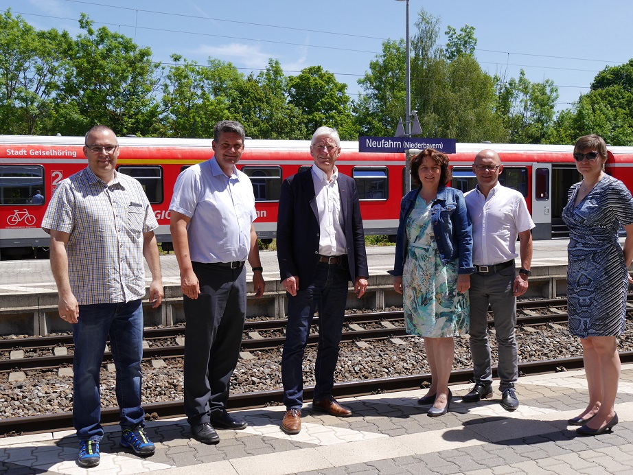 Bildunterschrift: Bernhard Roos, MdL (3.v.li.) informierte sich persönlich über die Verhältnisse am Bahnhof Neufahrn. Mit dabei: (v.l.) Gemeinderat Alex Stigler, Bürgermeister Peter Forstner, Ruth Müller, MdL, Fraktionsvorsitzender im Kreistag Sebastian Hutzenthaler und Monika Forstner
