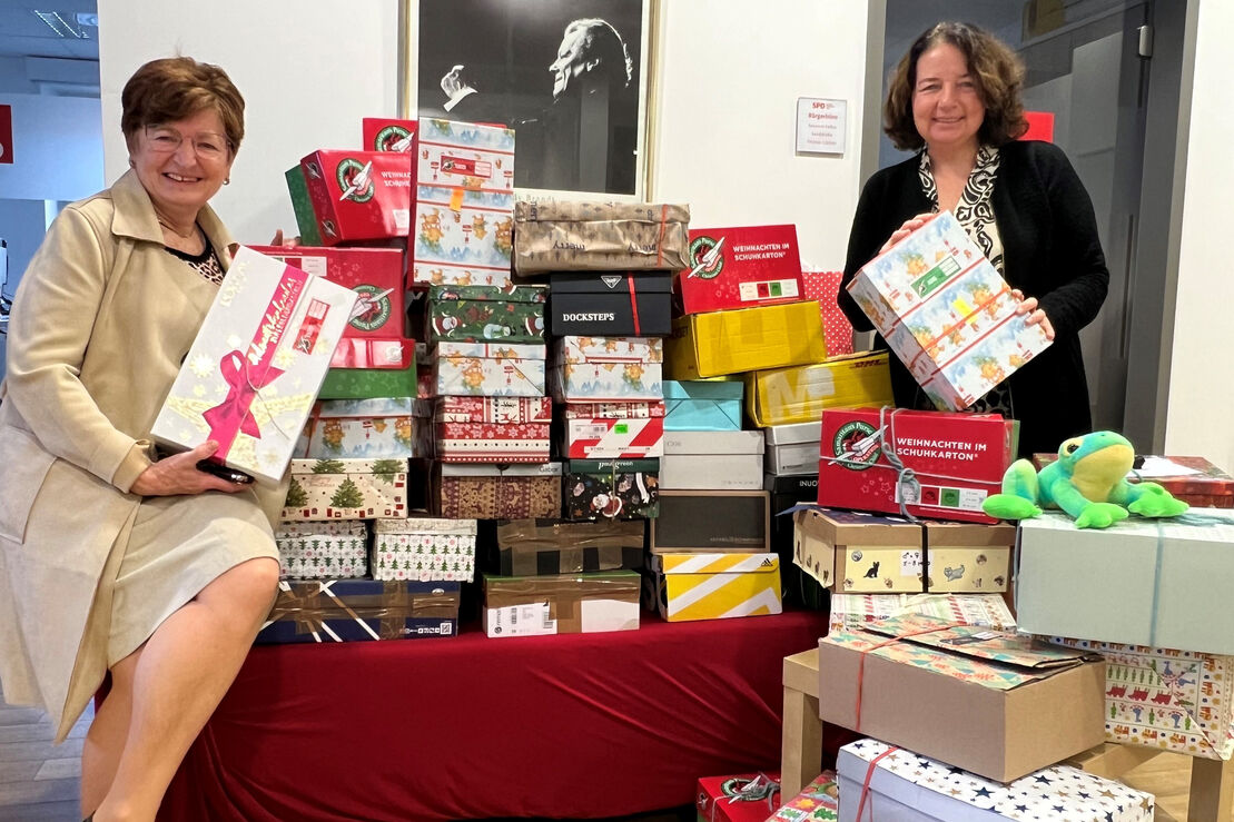 Wie auch schon im Vorjahr freuen sich die SPD-Abgeordneten Ruth Müller, MdL und die Rottenburger Stadträtin Mathilde Haindl über die rege Teilnahme an der Aktion „Weihnachten im Schuhkarton“.