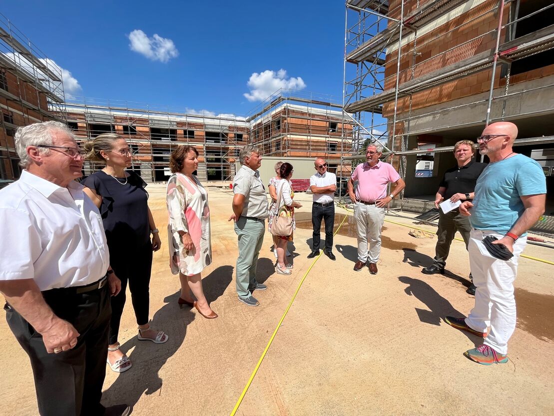 „Wir bauen hier einen hohen Standard, aber keinen Luxus“, sagte Strauß, während er die Gäste der SPD über die Baustelle führte. Besonders interessiert waren die Kreisräte um Sabine Größer und Sibylle Entwistle an der Sozialstation und der Tagespflege mit 18 Plätzen, die ebenfalls in der Wohnanlage Platz finden sollen. AWO-Geschäftsführer Philipp Buchta erläuterte das Konzept. Er hat sogar Ideen, wie die AWO das Mehr-Generationen-Wohnen noch zusätzlich bereichern könnte.