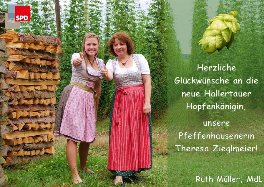 Dass die neue Hallertauer Hopfenkönigin aus ihrer Heimatgemeinde Pfeffenhausen kommt, freut die Landtagsabgeordnete Ruth Müller besonders. „Theresa Zieglmeier war bereits Faschingsprinzessin, die Krönung zur Hopfenkönigin hat sie absolut verdient. Hopfen ist ein identitätsstiftendes Merkmal unserer Region, die Landwirtschaft leistet einen wichtigen Beitrag zur Wirtschaftskraft denn jeder siebte Arbeitsplatz liegt im landwirtschaftlichen Bereich verankert.“, so Müller, die Mitglied im Ausschuss für Landwirtschaft und Forsten ist. In dieser Funktion freue sie sich bereits darauf, Theresa Zieglmeier bei vielen Veranstaltungen wie beispielsweise der Grünen Woche in Berlin anzutreffen.